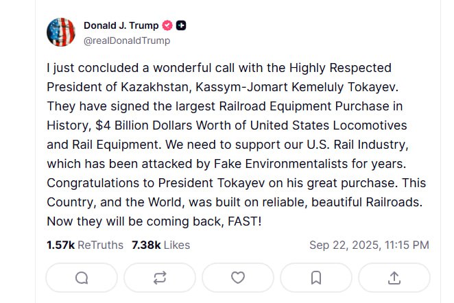 Президент США Дональд Трамп, комментируя сделку в Truth Social, выразил восторг: «Я только что завершил отличный разговор с уважаемым президентом Казахстана Касым-Жомартом Токаевым. Они подписали самую крупную сделку в истории по покупке железнодорожного оборудования — локомотивов и вагонов из США на $4 млрд. Мы должны поддерживать американскую железнодорожную промышленность, которая годами подвергалась атакам фейковых экологов. Поздравляю президента Токаева с его великой покупкой. Эта страна и весь мир построены на надёжных и красивых железных дорогах. Теперь они вернутся, и быстро!» Truth Social, 18 сентября 2025.