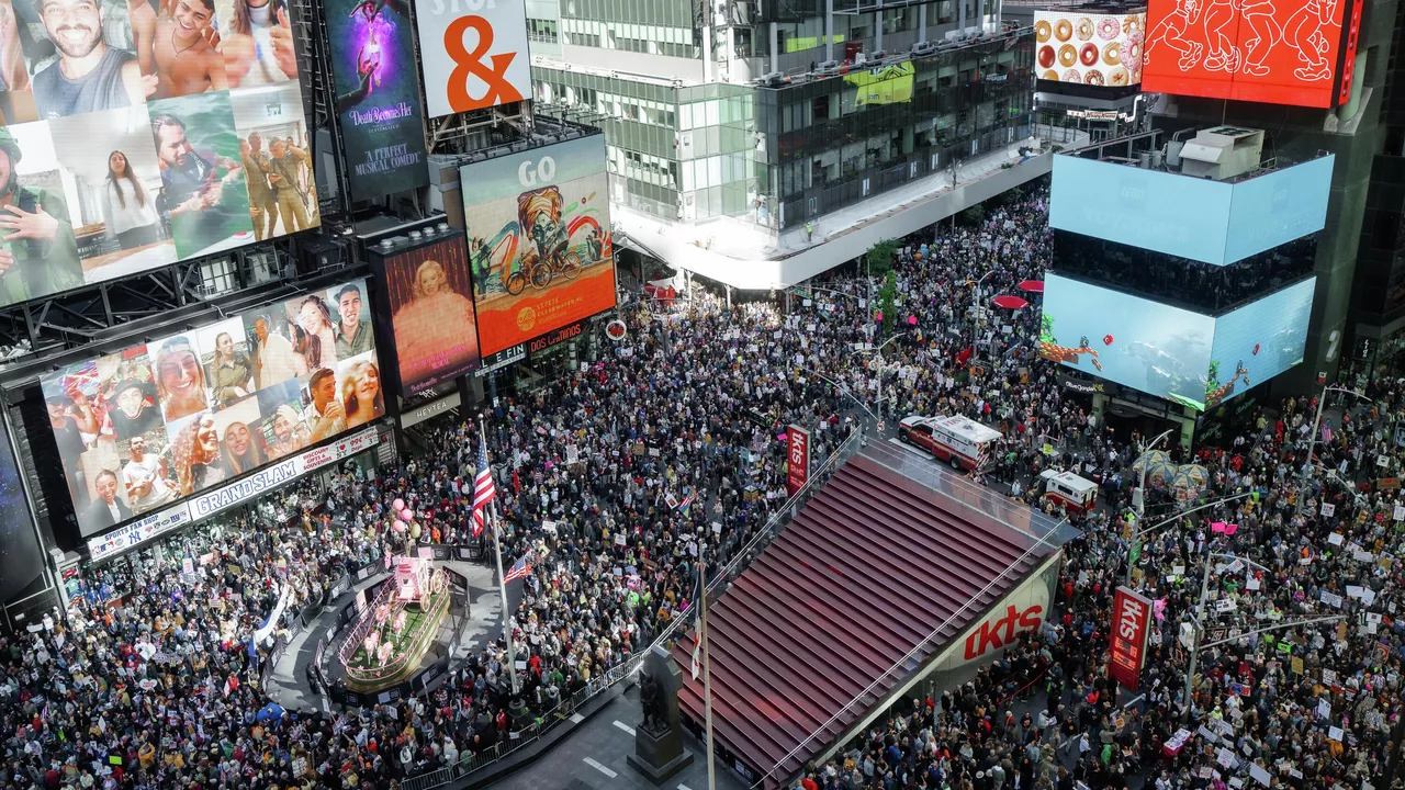 В Нью-Йорке на Таймс-сквер собрались десятки тысяч в карнавальной атмосфере: улицы заполнили самодельные плакаты вроде «I Pledge Allegiance to No King» («Клянусь верностью — не королю») и «Nothing is more patriotic than protesting» («Нет ничего патриотичнее протеста»).