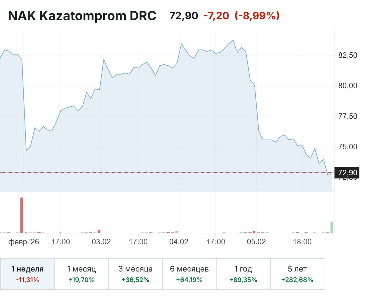 Текущая капитализация «Казатомпром» остаётся одной из крупнейших на KASE (~$10–11 млрд по состоянию на февраль 2026). Падение недели пока воспринимается рынком как коррекция после сильного ралли 2025 года.
