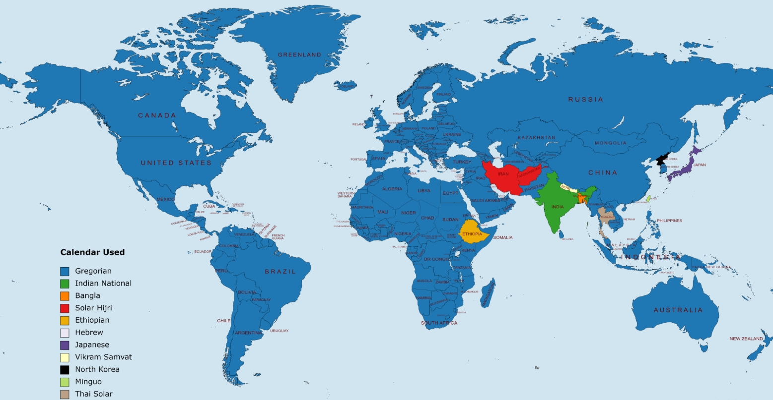 - Северная Корея: Григорианский + чучхе (Juche) — ранее от рождения Ким Ир Сена, но с 2024 года преимущественно григорианский.